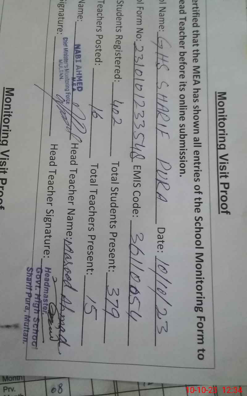 | EMIS Code: 36110054 | Name of School: GHS SHARIF PURA BAIWA COLONY MULTAN | |||