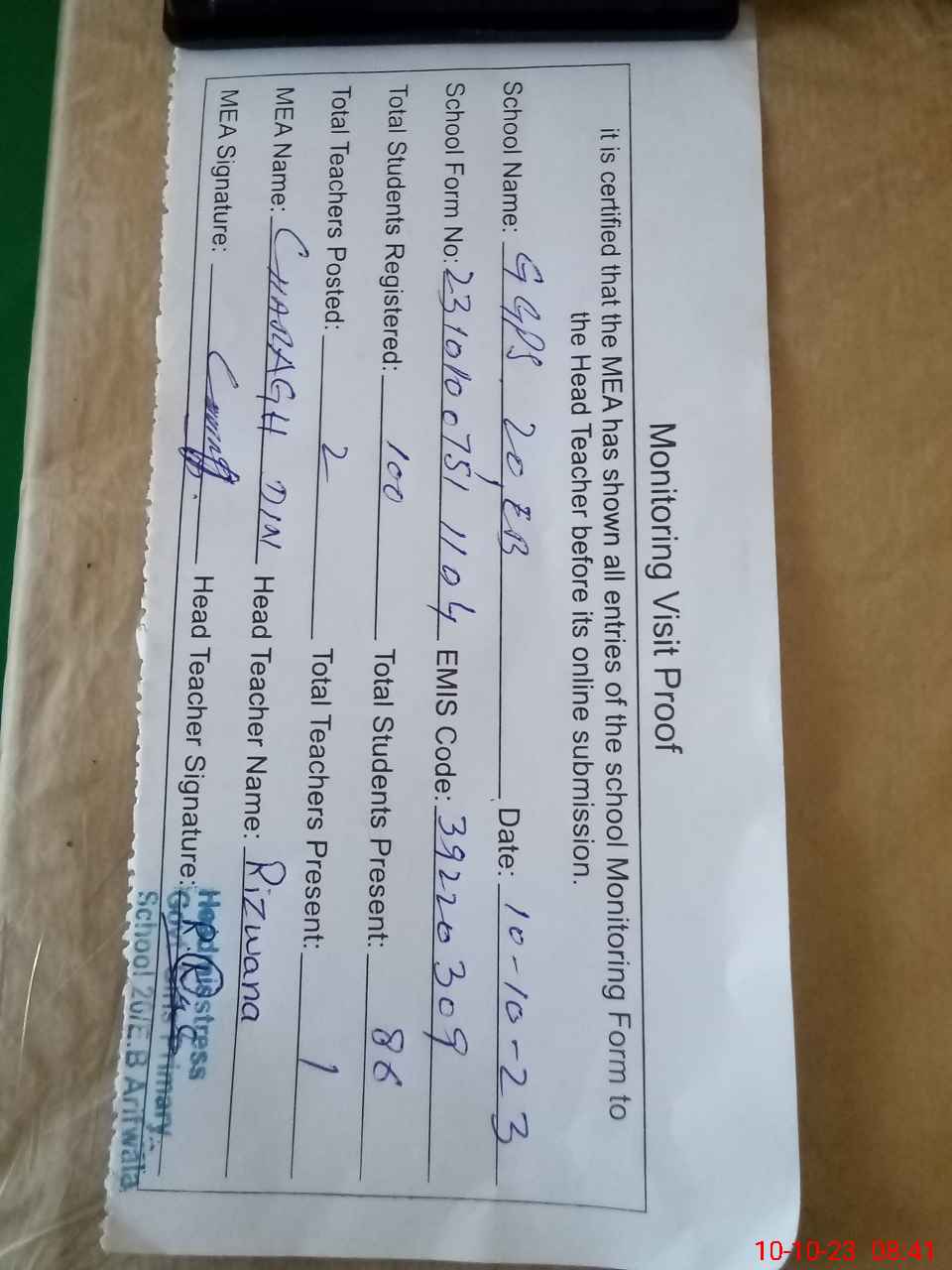 | Certified that this School was Inspected by the Undersigned MEA/DMO Today and the Information Stated Above is as Per Record. | |||||