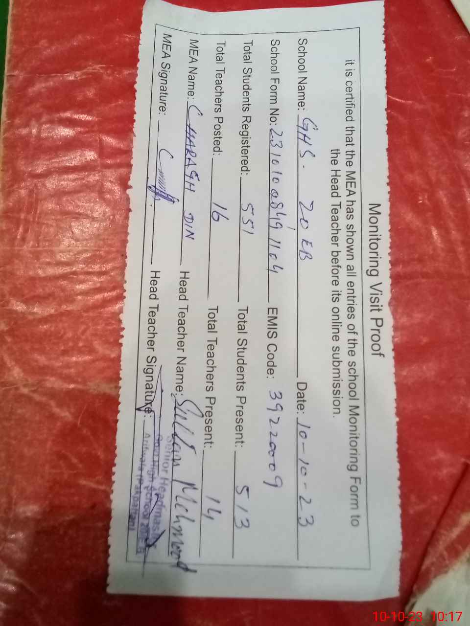 | Attendance Register | Head Teacher | MEA with School | Visit Proof |
