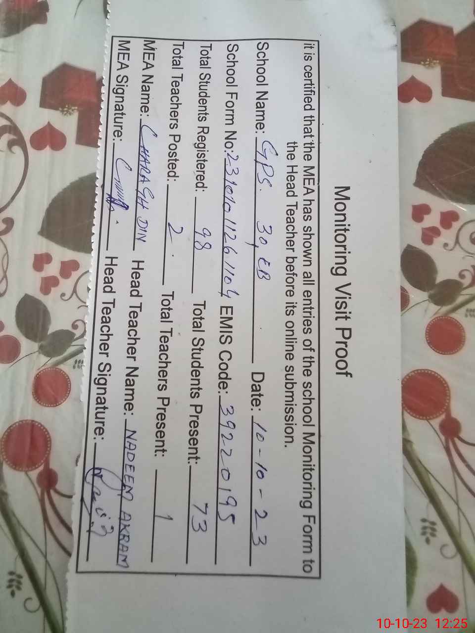 | Certified that this School was Inspected by the Undersigned MEA/DMO Today and the Information Stated Above is as Per Record. | |||||