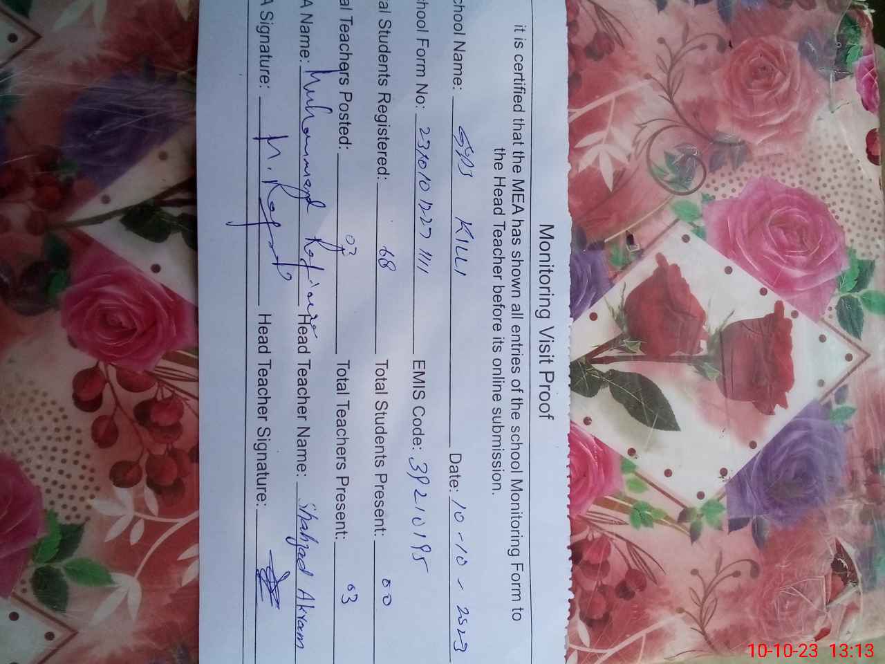 | Name: SH**** AK**** Designation: (School Headmaster's/Headmistress's) PST Phone/Cell Number: 03**** |