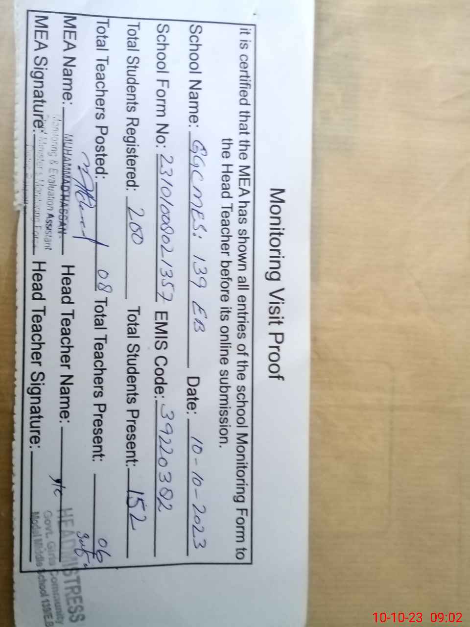 | EMIS Code: 39220382 | Name of School: GGCMES 139 EB ARIFWALA | |||