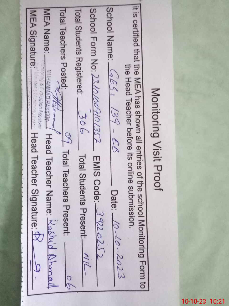 | EMIS Code: 39220252 | Name of School: GES CHAK NO 139 EB | |||