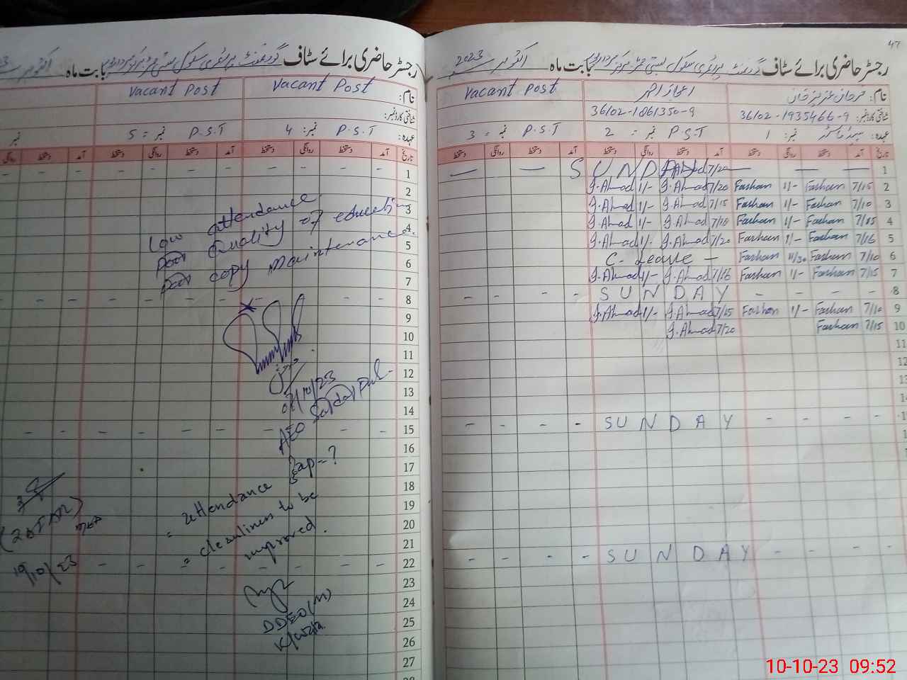 | CNIC | Full Name | Designation | R/C | Absence During Last Calender Month |