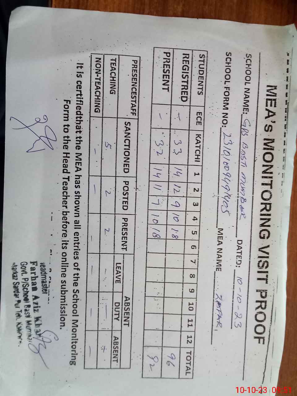 | Attendance Register | Head Teacher | MEA with School | Visit Proof |
