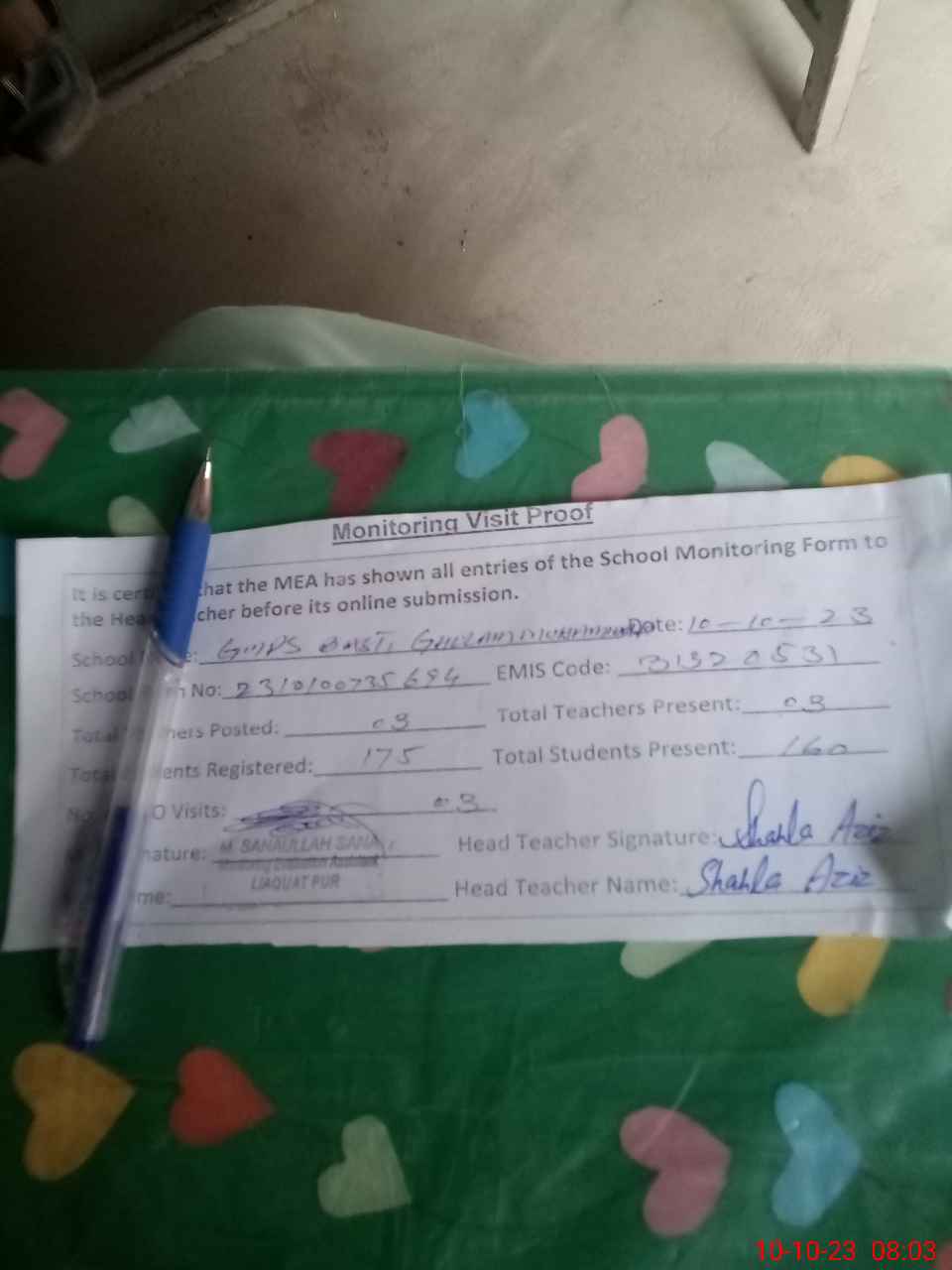 | Certified that this School was Inspected by the Undersigned MEA/DMO Today and the Information Stated Above is as Per Record. | |||||
