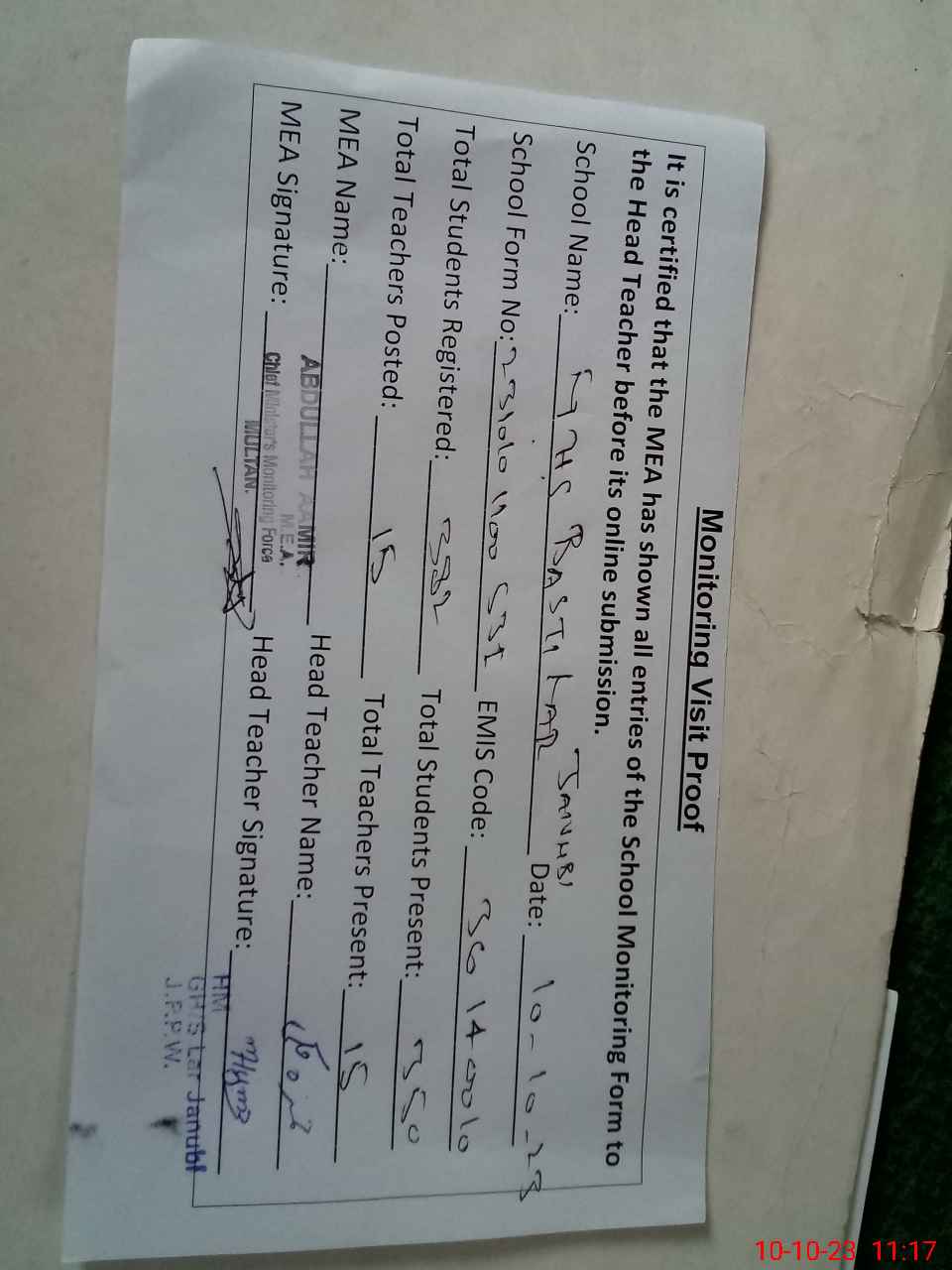 | Certified that this School was Inspected by the Undersigned MEA/DMO Today and the Information Stated Above is as Per Record. | |||||
