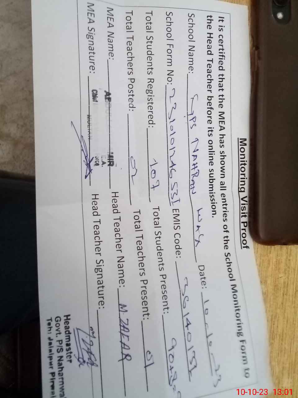 | Attendance Register | Head Teacher | MEA with School | Visit Proof |