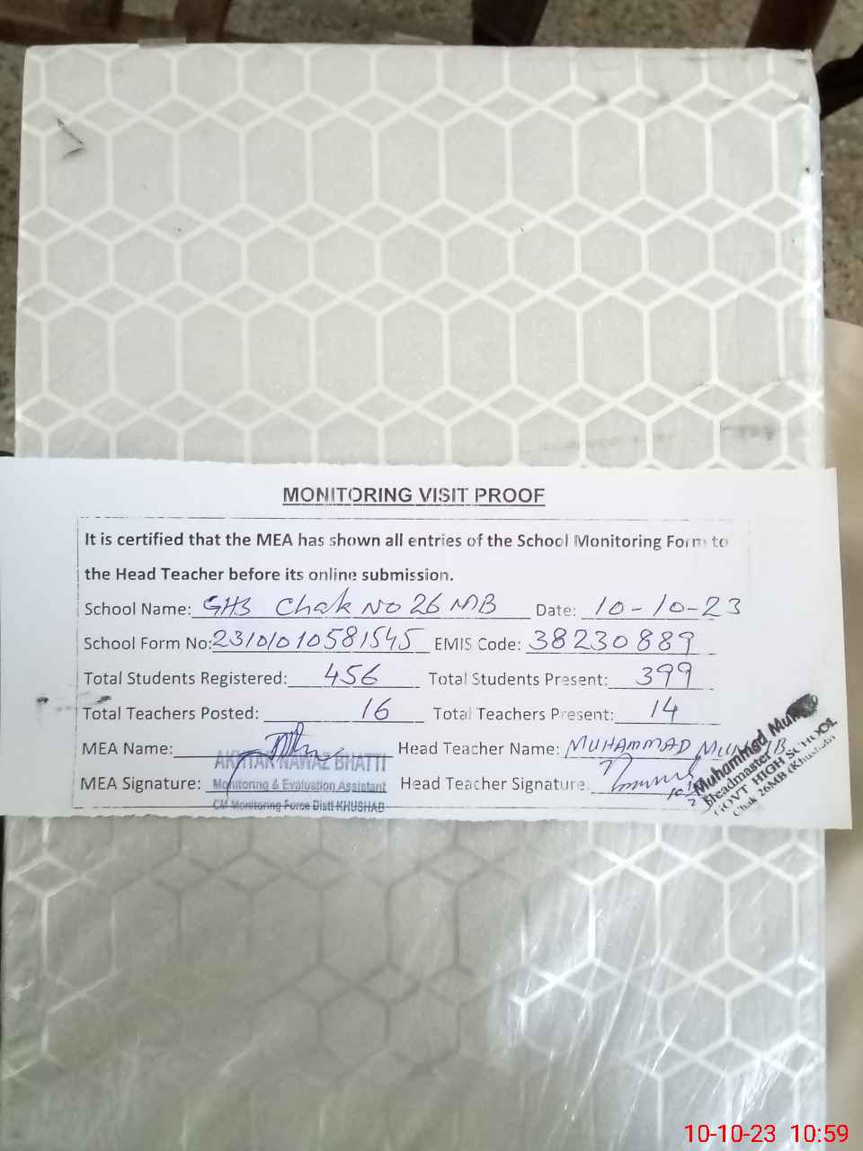 | Certified that this School was Inspected by the Undersigned MEA/DMO Today and the Information Stated Above is as Per Record. | |||||