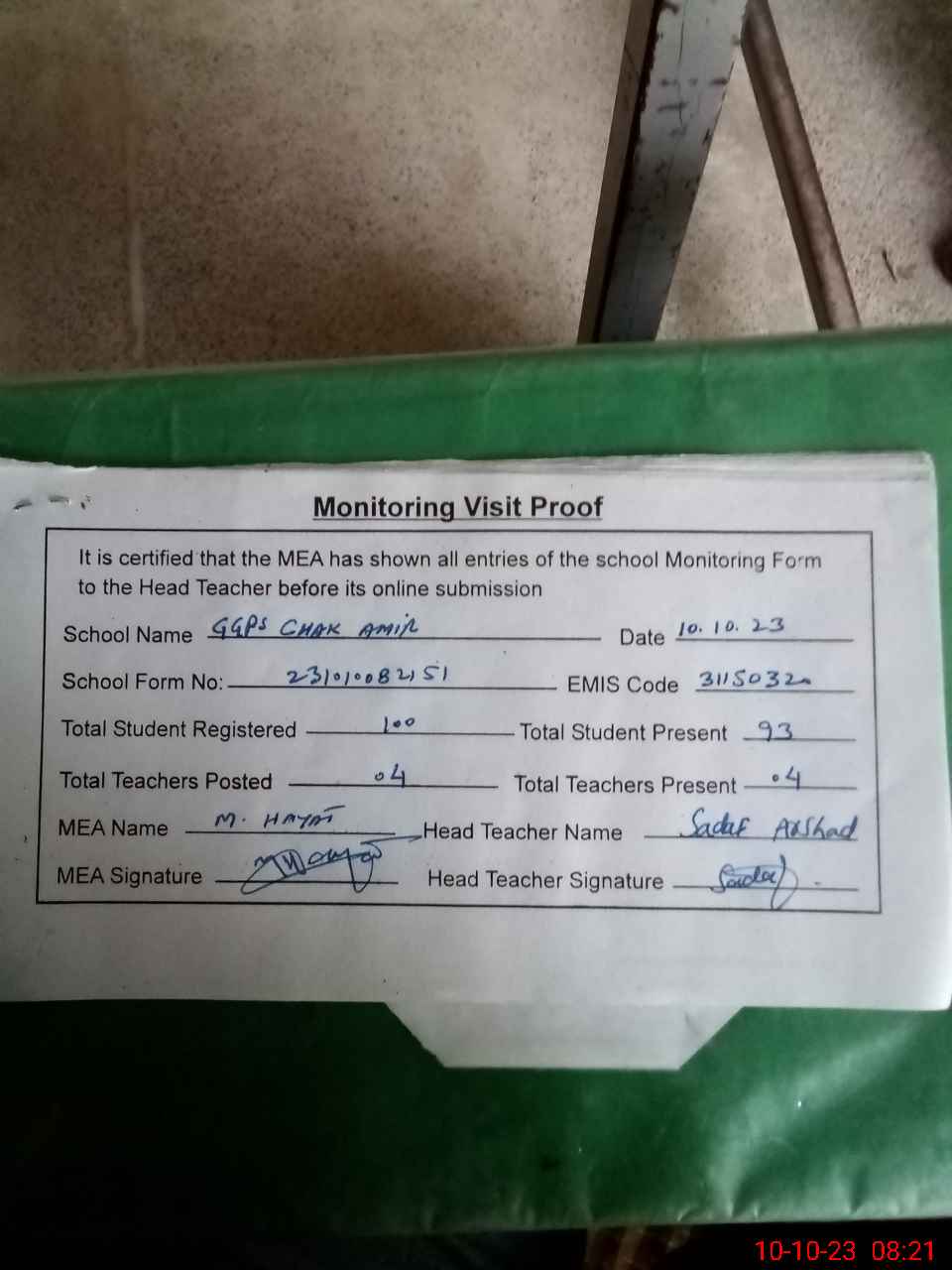 | Attendance Register | Head Teacher | MEA with School | Visit Proof |