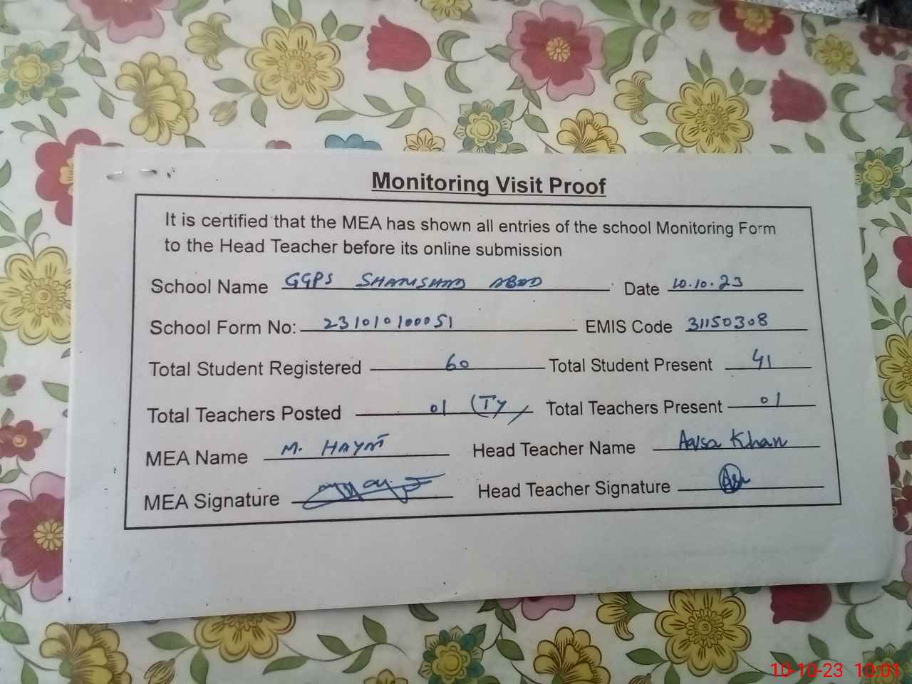 | EMIS Code: 31150308 | Name of School: GGPS SHAMSHAD ABAD | |||