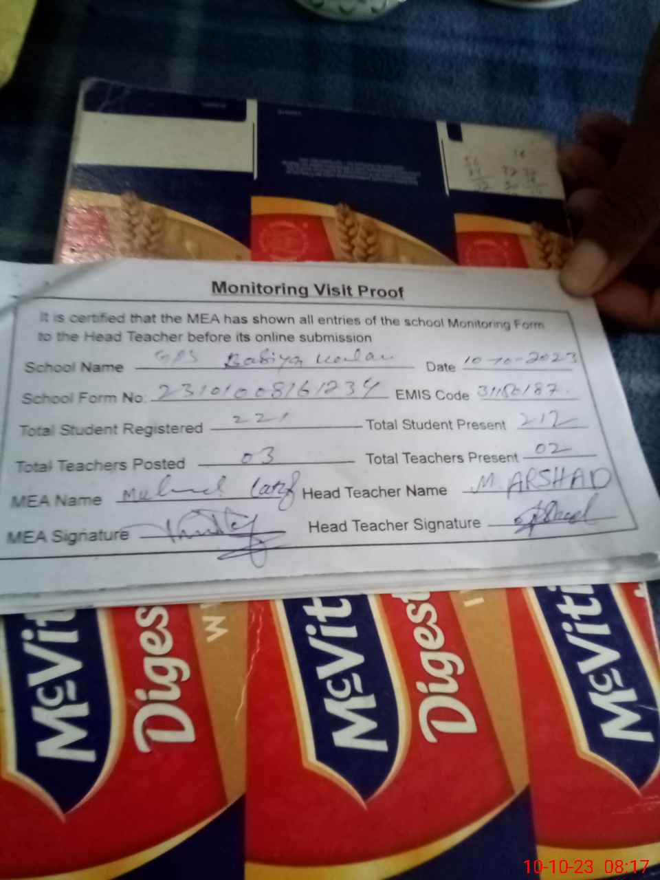 | Attendance Register | Head Teacher | MEA with School | Visit Proof |