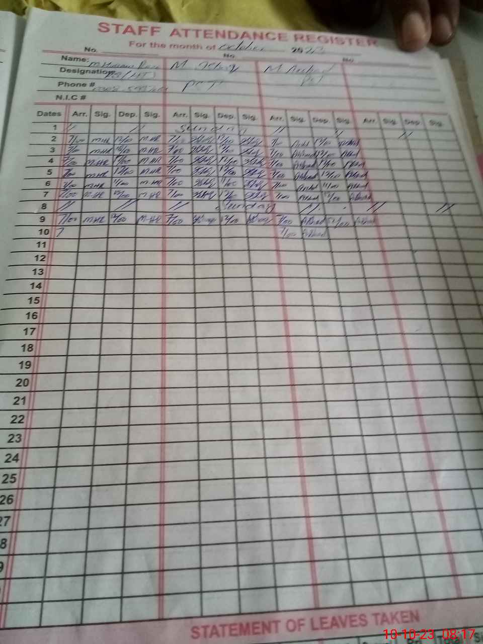 | CNIC | Full Name | Designation | R/C | Absence During Last Calender Month |