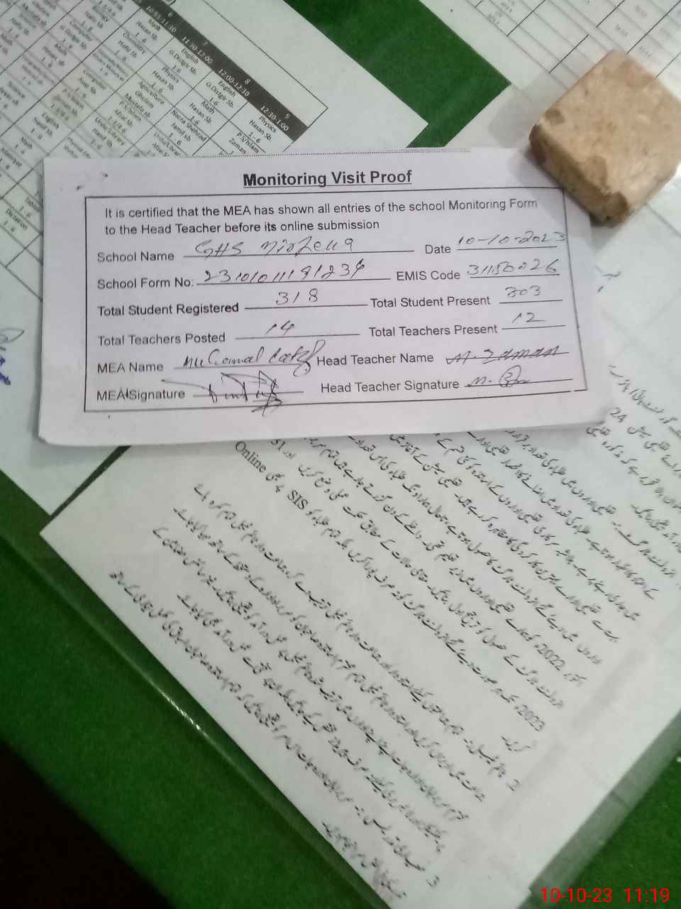 | Certified that this School was Inspected by the Undersigned MEA/DMO Today and the Information Stated Above is as Per Record. | |||||