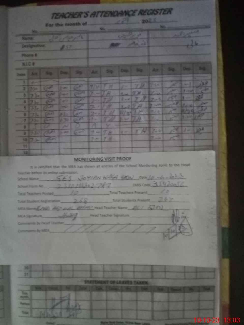 | Attendance Register | Head Teacher | MEA with School | Visit Proof |