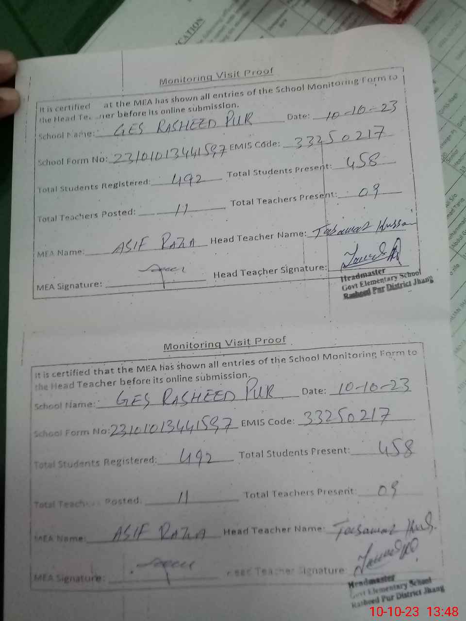 | Attendance Register | Head Teacher | MEA with School | Visit Proof |