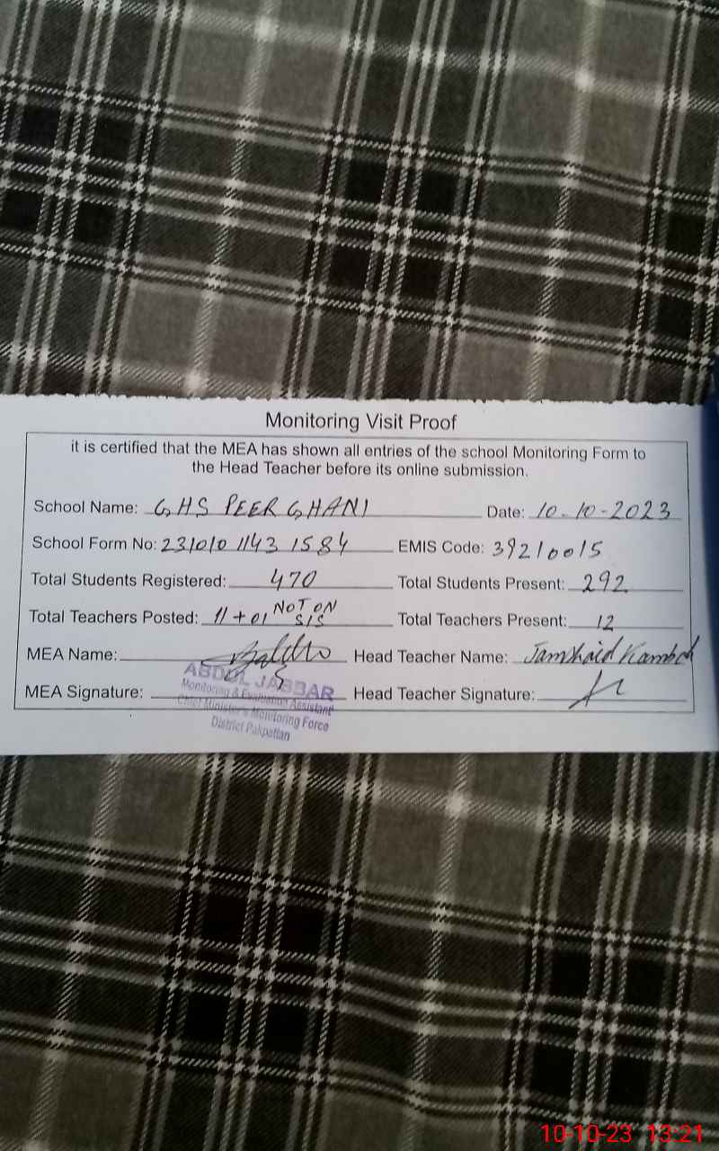 | EMIS Code: 39210015 | Name of School: GHS PEER GHANI | |||