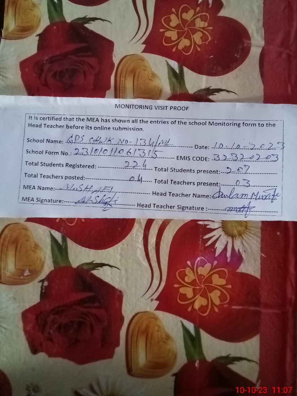 | Attendance Register | Head Teacher | MEA with School | Visit Proof |