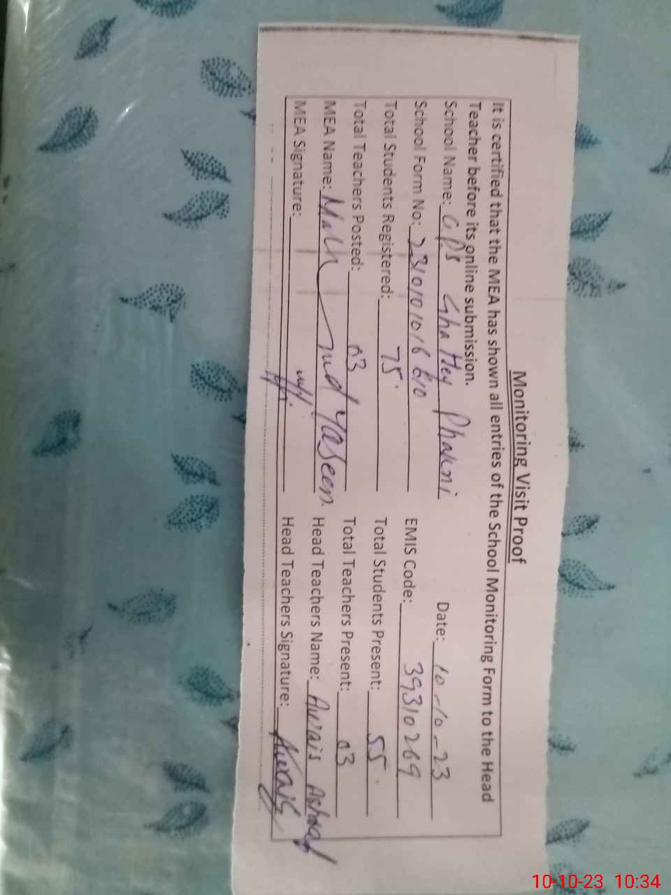 | Attendance Register | Head Teacher | MEA with School | Visit Proof |