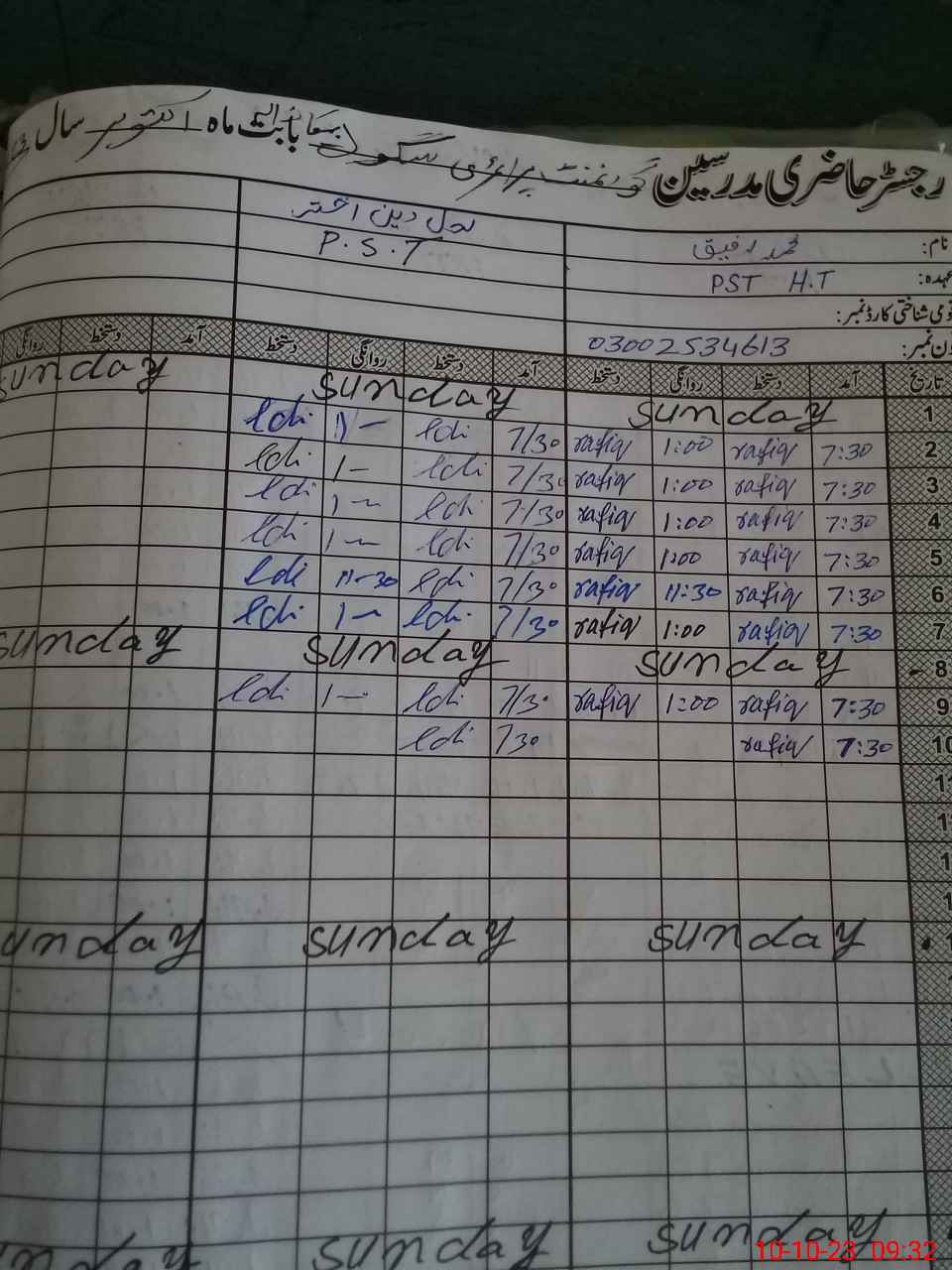 | Name: MU**** RA**** Designation: (School Headmaster's/Headmistress's) PST Phone/Cell Number: 03**** |