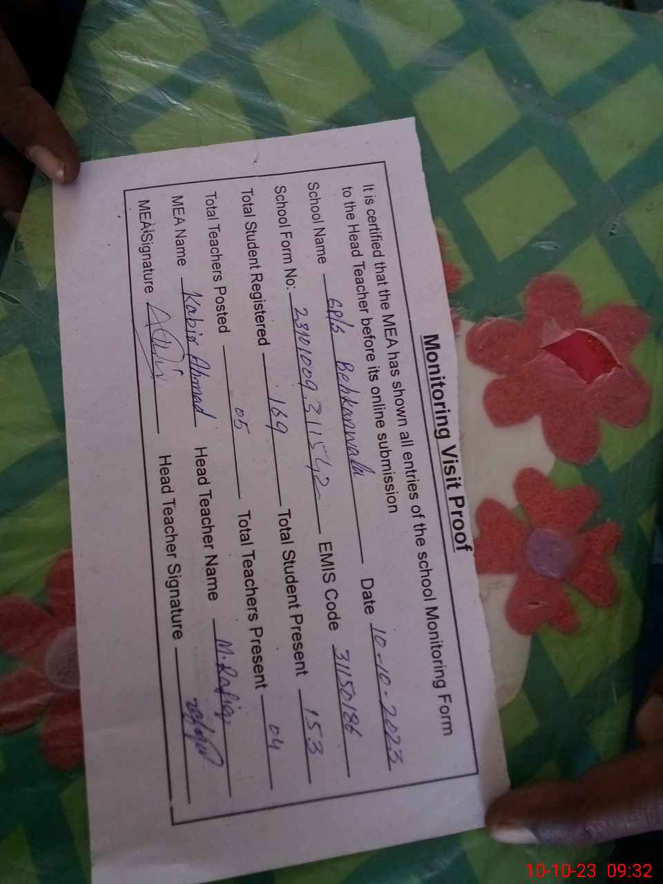 | Attendance Register | Head Teacher | MEA with School | Visit Proof |