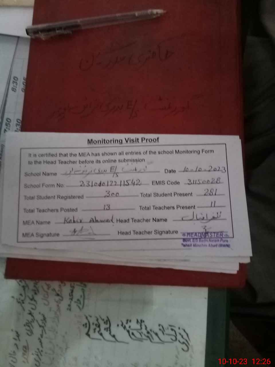 | Attendance Register | Head Teacher | MEA with School | Visit Proof |