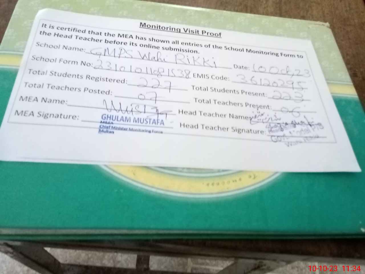 | Monitoring Date: 10-10-2023 | Start Time: 10-10-2023 11:07 AM | End Time: 10-10-2023 11:35 AM | Name of MEA: Gh**** Mu**** | |