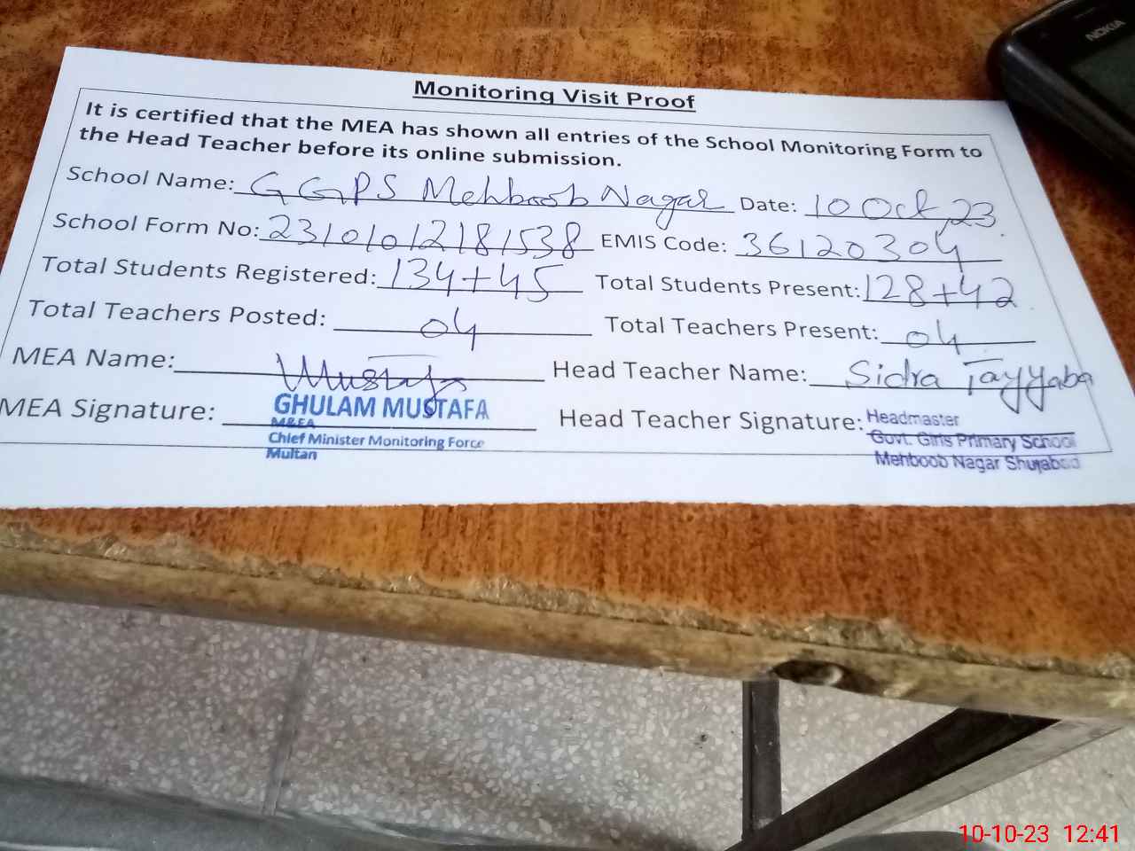 | Monitoring Date: 10-10-2023 | Start Time: 10-10-2023 12:17 PM | End Time: 10-10-2023 12:44 PM | Name of MEA: Gh**** Mu**** | |