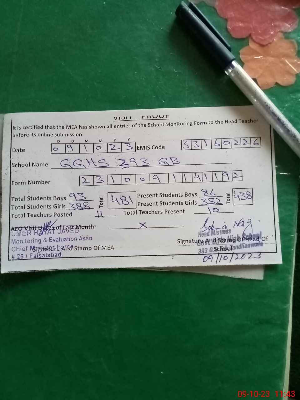 | Attendance Register | Head Teacher | MEA with School | Visit Proof |