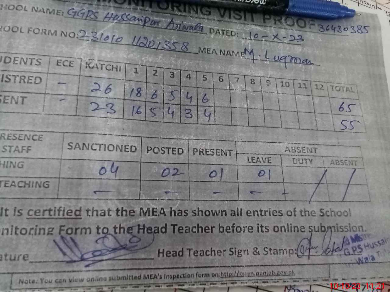 | EMIS Code: 36430385 | Name of School: GGPS HUSSAIN PUR ARI WALA, TULAMBA | |||