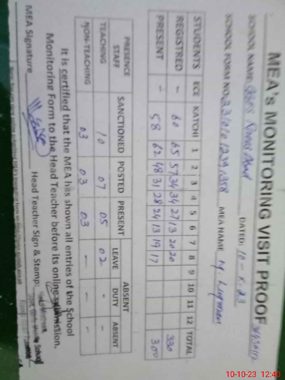 | Certified that this School was Inspected by the Undersigned MEA/DMO Today and the Information Stated Above is as Per Record. | |||||