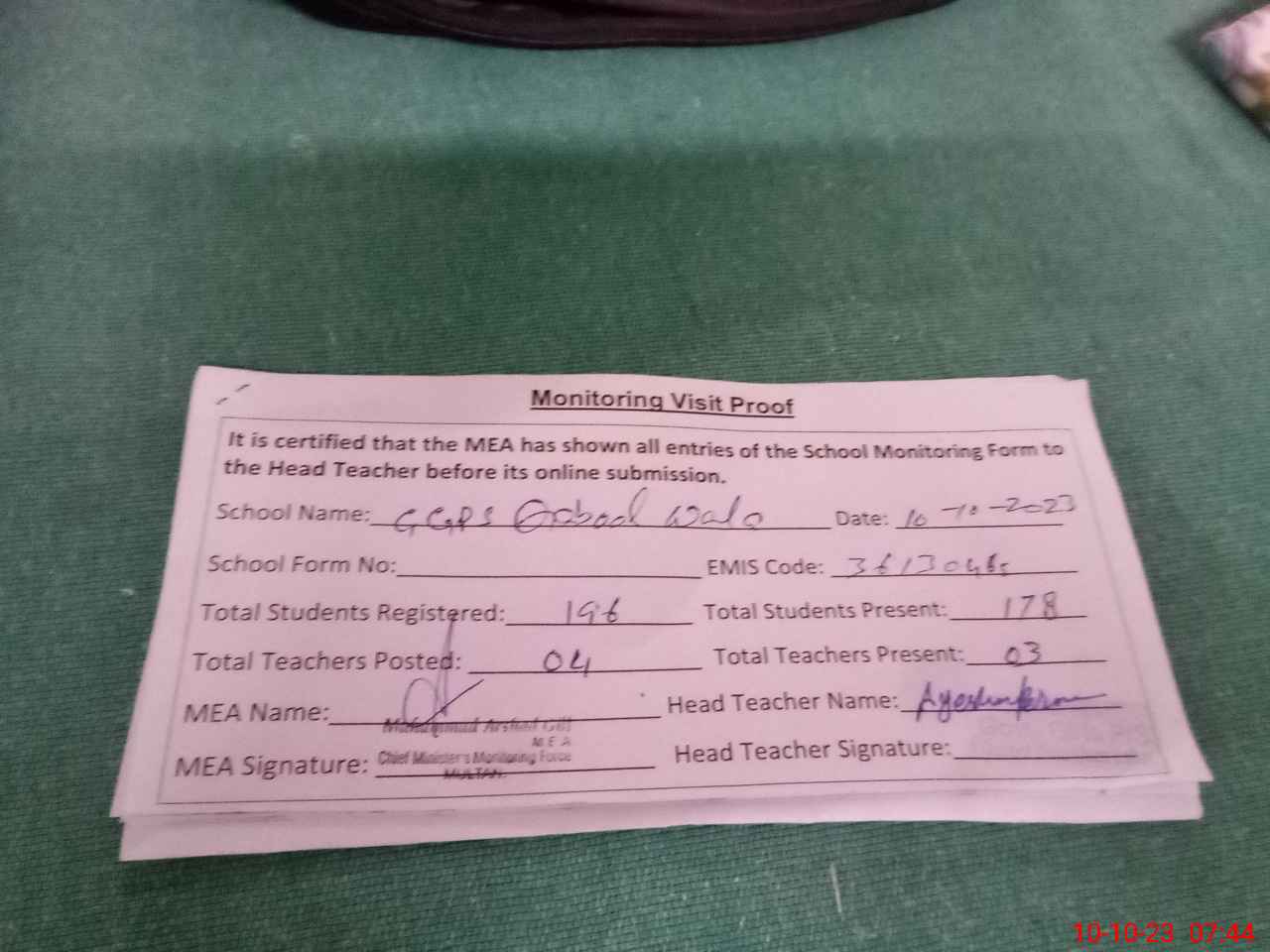 | Attendance Register | Head Teacher | MEA with School | Visit Proof |