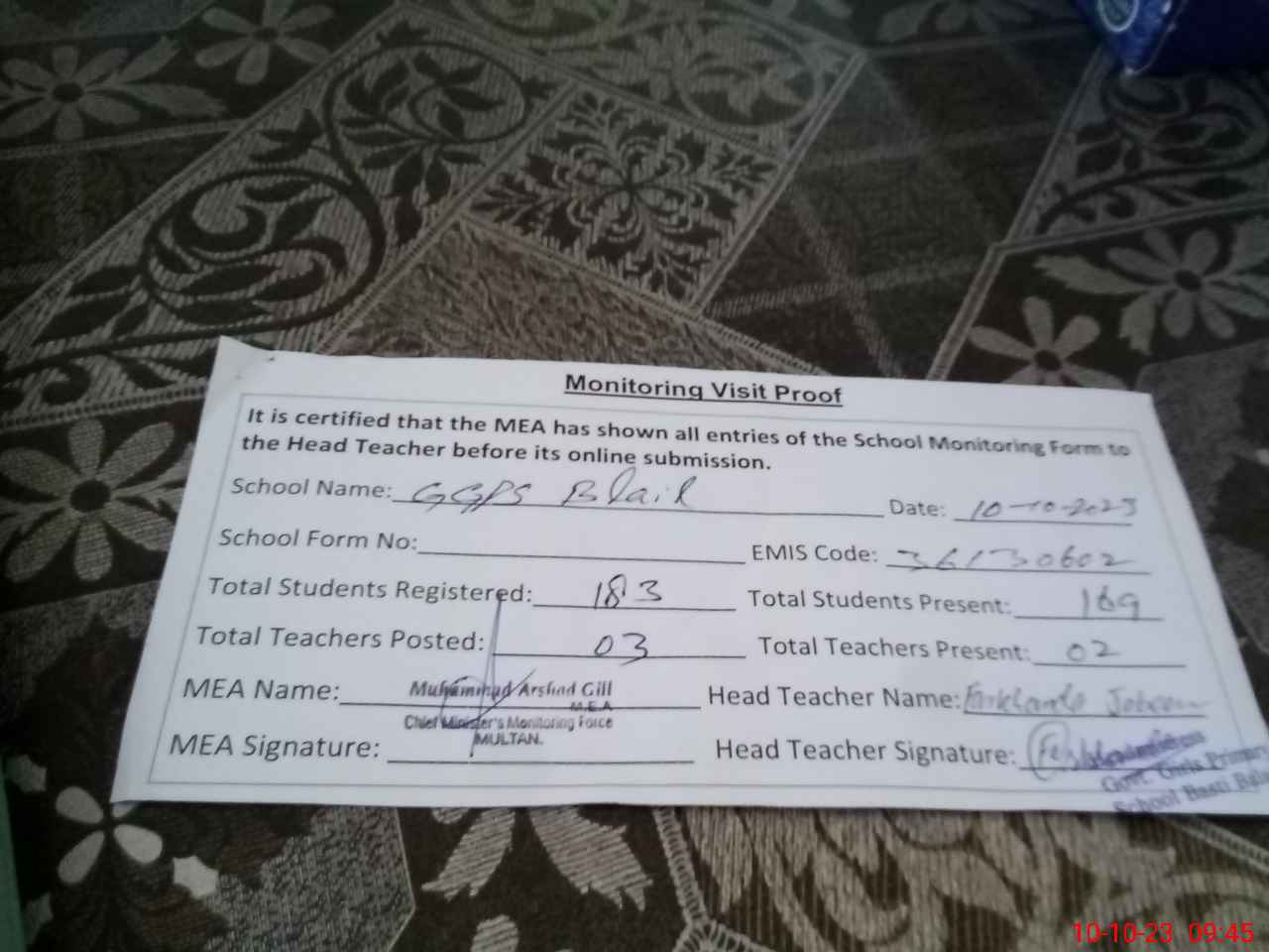 | Attendance Register | Head Teacher | MEA with School | Visit Proof |
