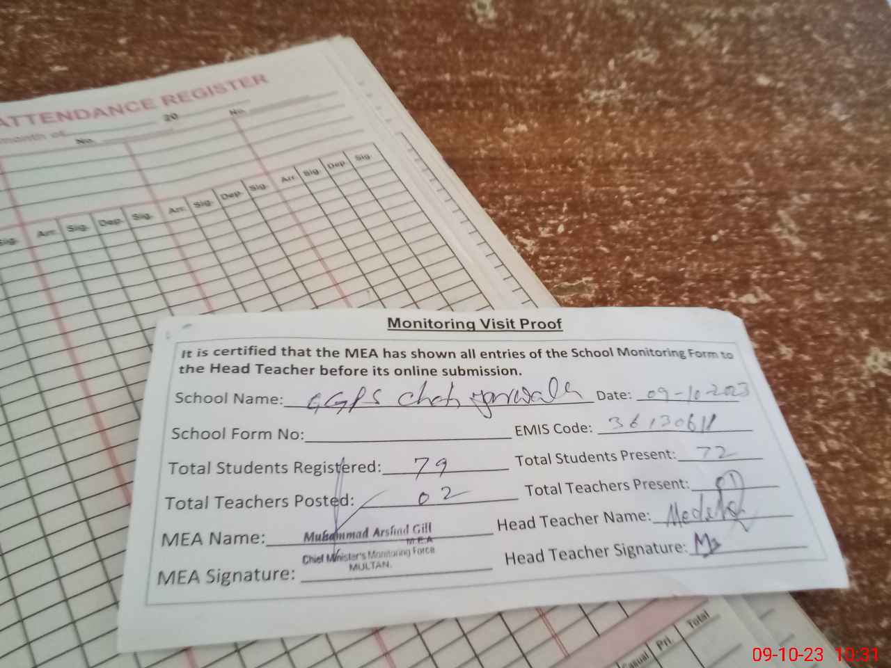 | Attendance Register | Head Teacher | MEA with School | Visit Proof |
