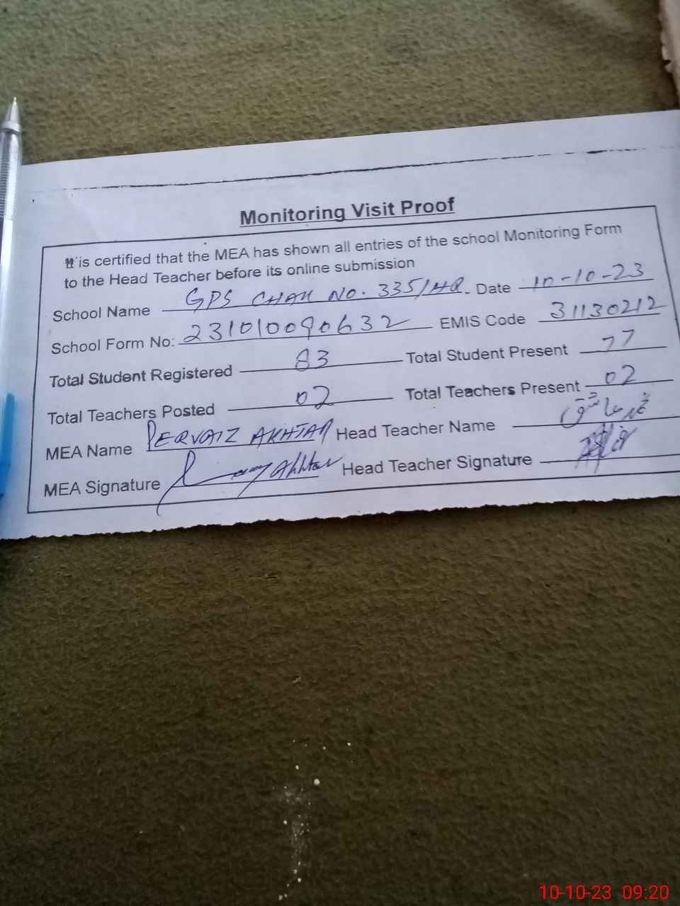 | Attendance Register | Head Teacher | MEA with School | Visit Proof |