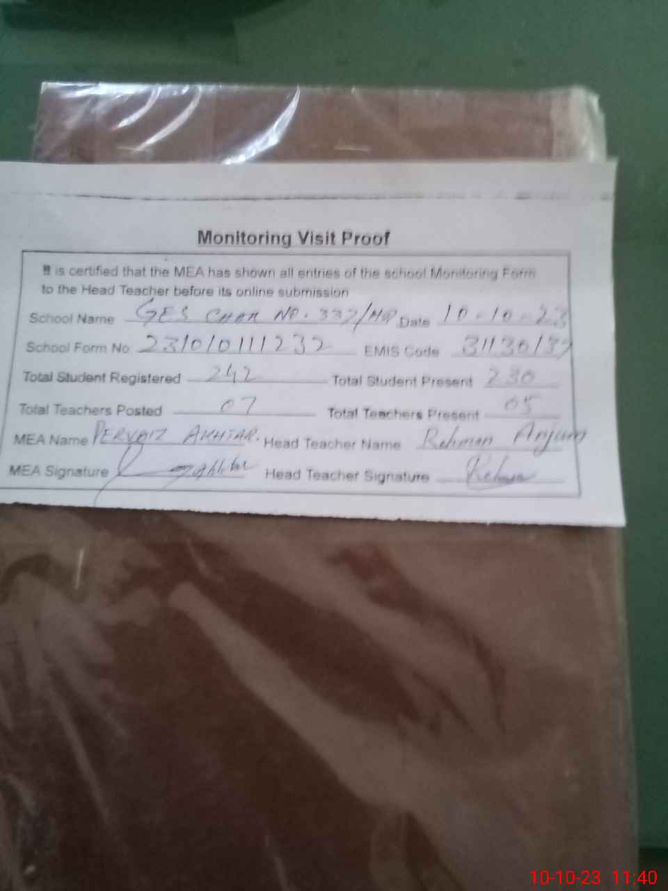 | Attendance Register | Head Teacher | MEA with School | Visit Proof |