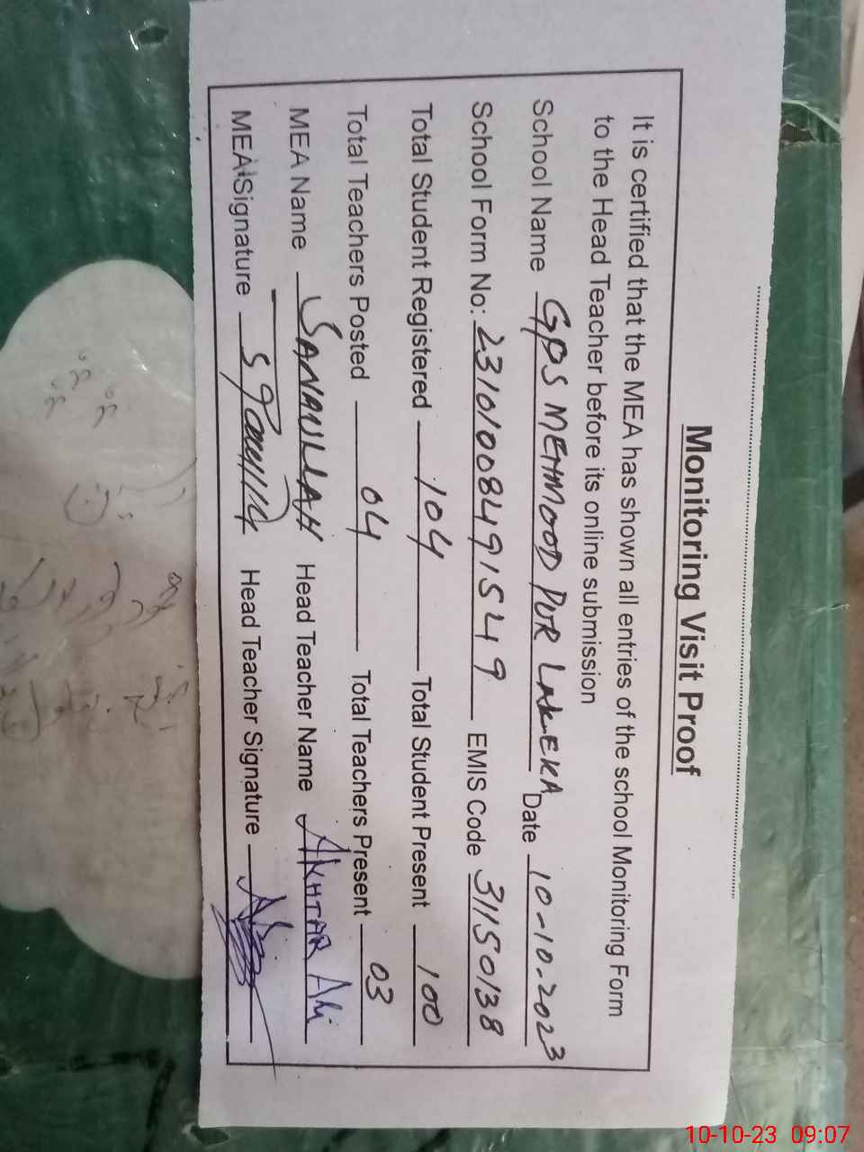 | Attendance Register | Head Teacher | MEA with School | Visit Proof |