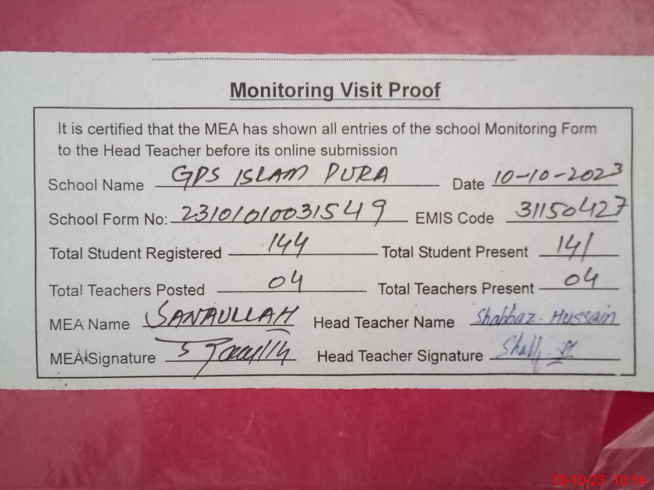 | EMIS Code: 31150427 | Name of School: GPS ISLAM PURA | |||