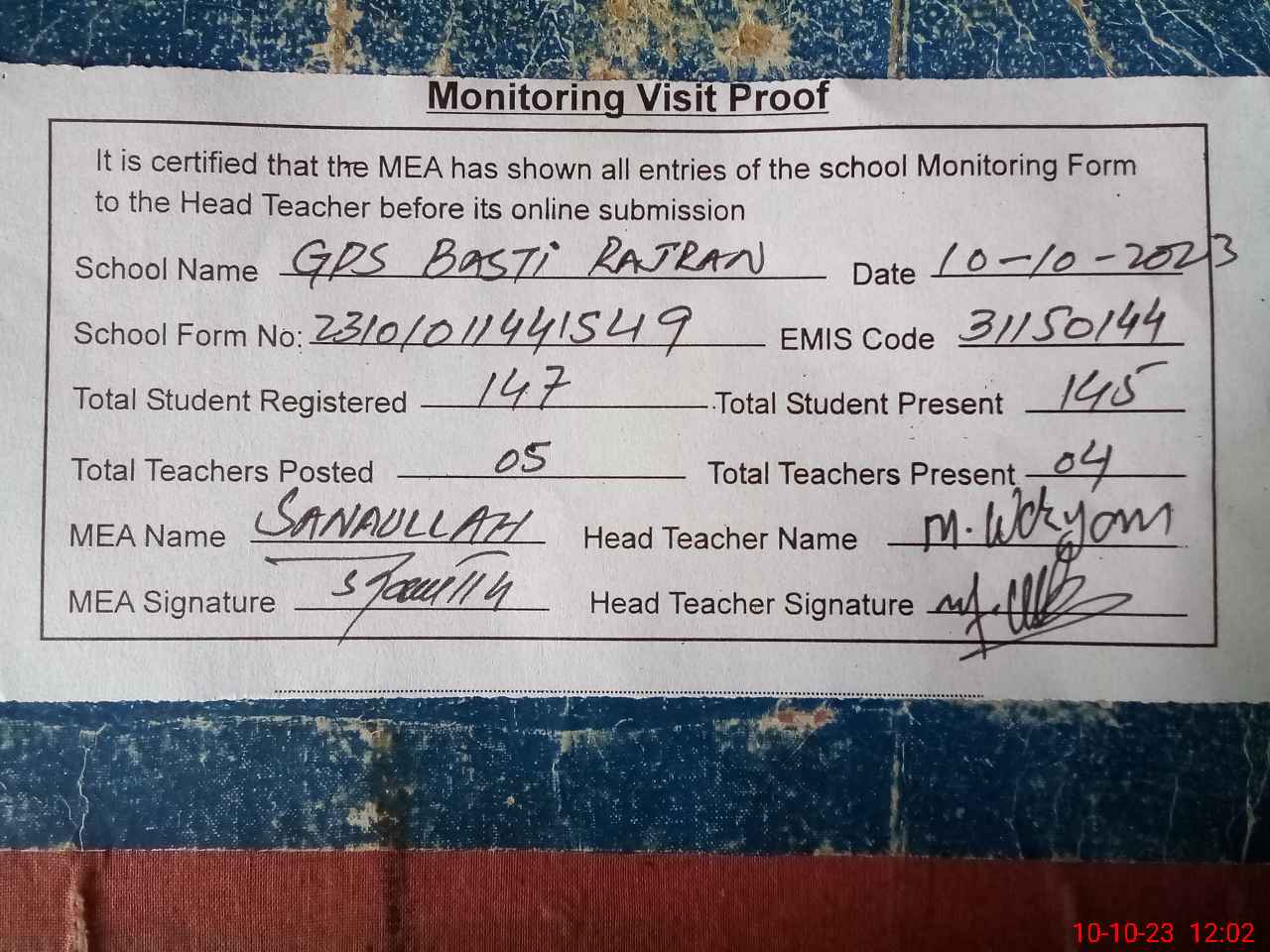 | Attendance Register | Head Teacher | MEA with School | Visit Proof |