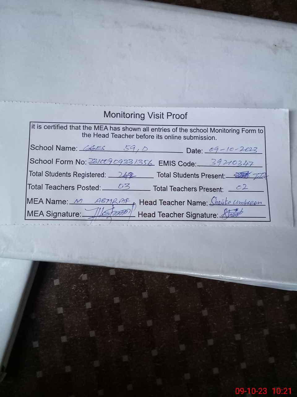 | Attendance Register | Head Teacher | MEA with School | Visit Proof |