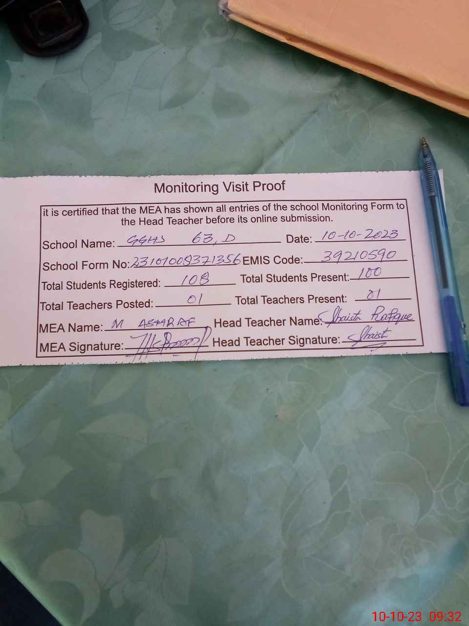 | Attendance Register | Head Teacher | MEA with School | Visit Proof |
