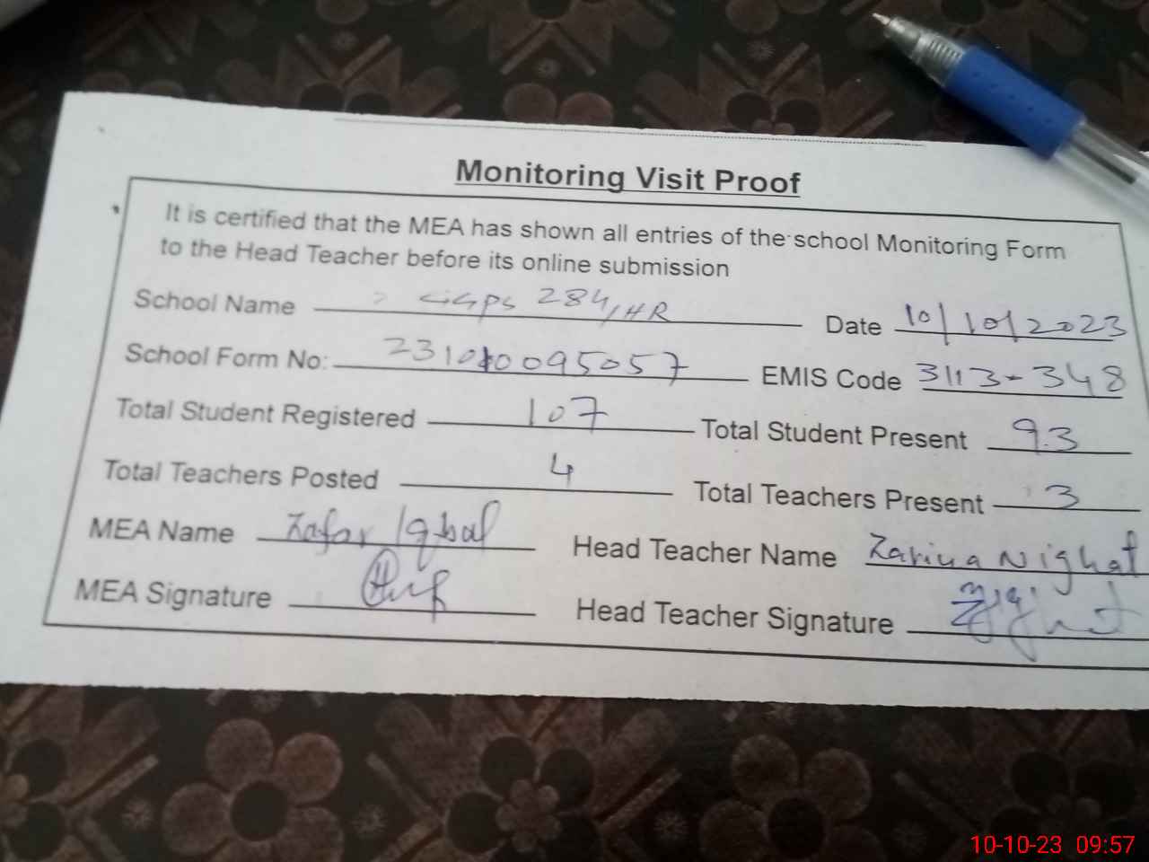 | Monitoring Date: 10-10-2023 | Start Time: 10-10-2023 09:39 AM | End Time: 10-10-2023 09:57 AM | Name of MEA: Za**** Iq**** BN**** | |