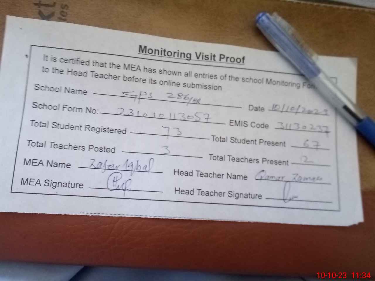 | Monitoring Date: 10-10-2023 | Start Time: 10-10-2023 11:19 AM | End Time: 10-10-2023 11:34 AM | Name of MEA: Za**** Iq**** BN**** | |