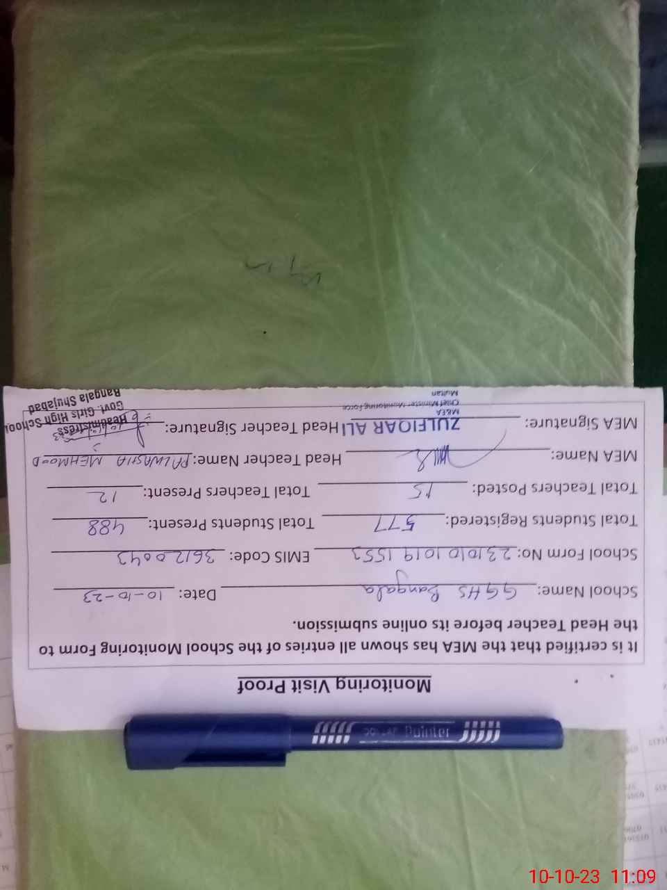 | Monitoring Date: 10-10-2023 | Start Time: 10-10-2023 10:19 AM | End Time: 10-10-2023 11:09 AM | Name of MEA: Zu**** Al**** | |