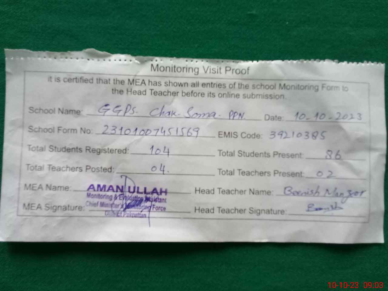| Monitoring Date: 10-10-2023 | Start Time: 10-10-2023 07:45 AM | End Time: 10-10-2023 09:07 AM | Name of MEA: AM**** UL**** | |