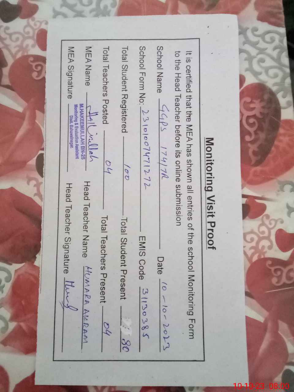 | EMIS Code: 31130385 | Name of School: GGPS CHAK NO 174/7-R | |||