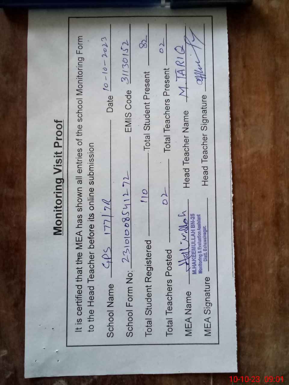 | Attendance Register | Head Teacher | MEA with School | Visit Proof |