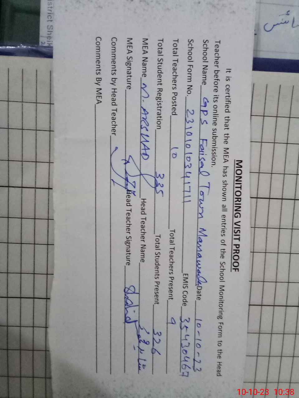 | EMIS Code: 35430467 | Name of School: GPS FAISAL TOWN | |||