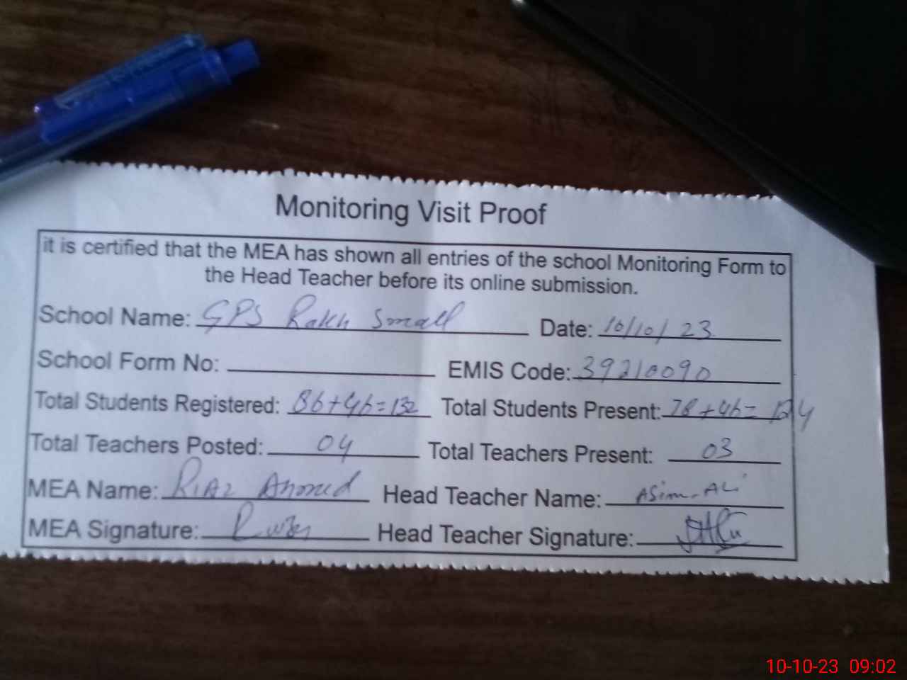| Attendance Register | Head Teacher | MEA with School | Visit Proof |