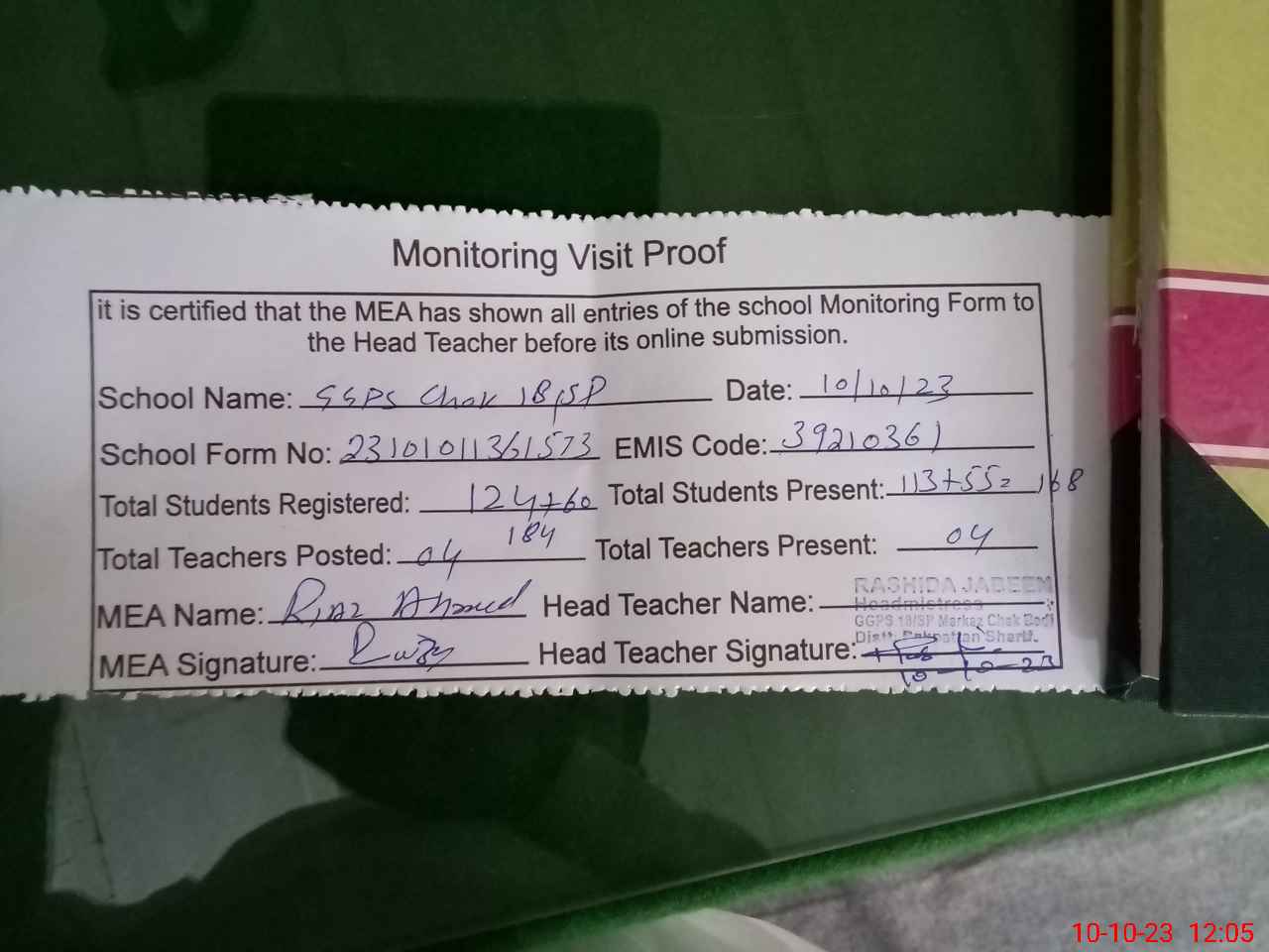 | Attendance Register | Head Teacher | MEA with School | Visit Proof |